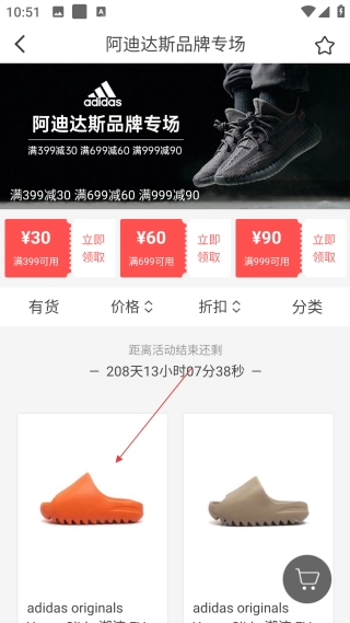 2、在品牌团页面,点击【阿迪达斯品牌专场】,进入该专场的商品列表页面。
