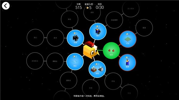 游戏包含两种模式:一种是限定回合数的种族任务模式,另一种是遭遇战模式,具体玩法这里就不展开了。刚开始玩的话,建议优先升级主城。不同种族在开局时能优先解锁的科技有所区别,玩家刚进入游戏会得到1个士兵单位和5个皇冠(暂时把它叫做科技点)。
