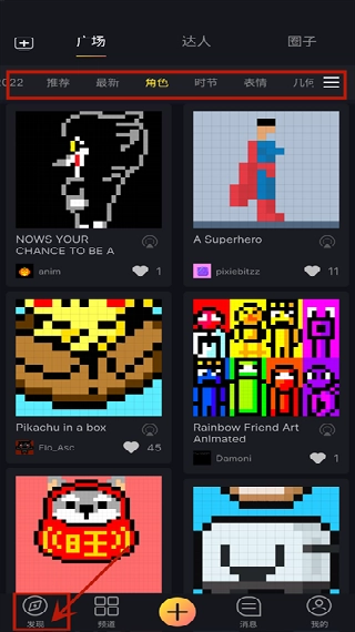 进入应用后,点击页面中间的方块按钮,就可以浏览广场上的动态和其他用户发布的作品。