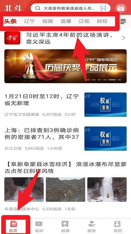 1、在首页区域,用户能够切换头条、辽宁、视频、直播、辽视、财经等频道,以便快速浏览各类新闻资讯,从而获取全面的信息。