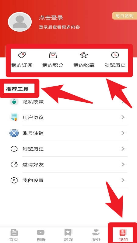 5、我的”页面集合了丰富的个人功能入口,包括订阅内容、积分信息、收藏夹和浏览历史等;同时也配备了隐私政策查询、账号注销服务以及邀请好友等实用工具。