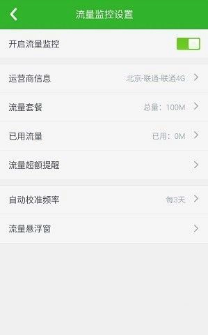 2、点击流量监控页面右上角的齿轮进入设置界面,在这里可以选择手机卡的运营商信息和流量套餐,如果购买了闲时流量的话,还可以在流量套餐选项里设置闲时流量。