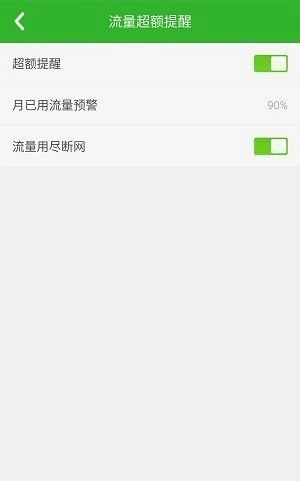 5、要是担心流量用超,还能在流量超额提醒里设置超额预警,这个功能默认处于开启状态,超额预警的默认设置比例为90%