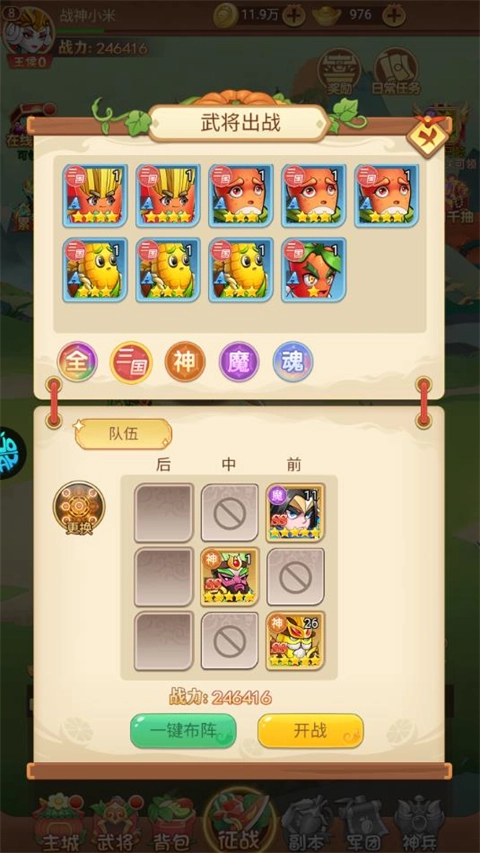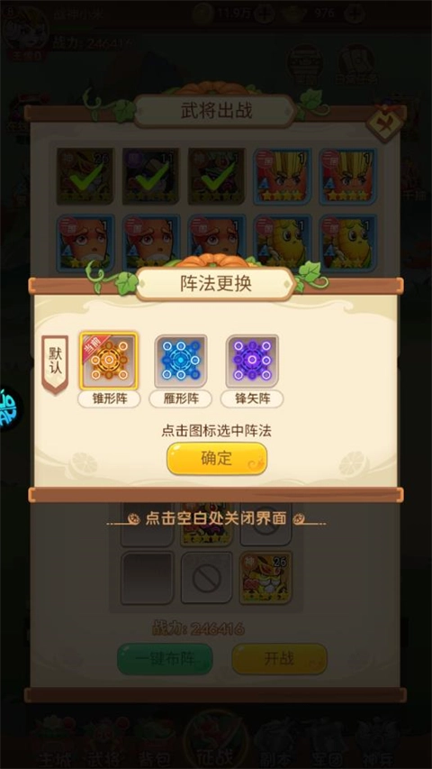 3、留意阵型组合:派出特定阵营的武将,在战斗时也能获取属性增益,依据自身现有的武将科学搭配阵型,同样能显著提升获胜概率。详细的搭配方式,可在[武将出战]界面里点击阵营图标进行查看。