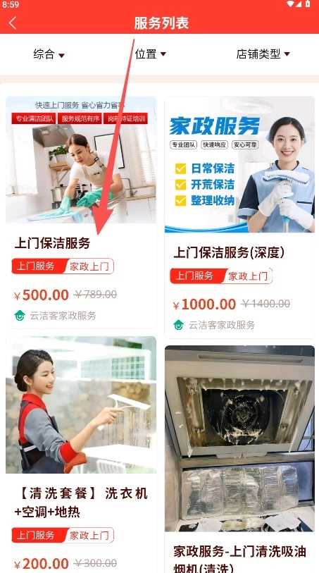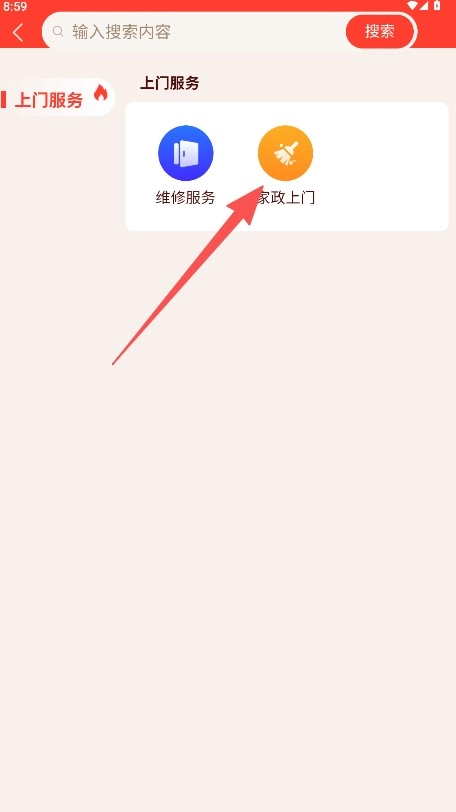 在首页的上门服务板块里找到“家政上门”选项并点击,即可进入家政服务列表页面。