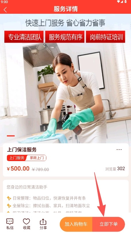 在详情页确认好服务信息后,点击“立即下单”按钮就能完成服务预约。