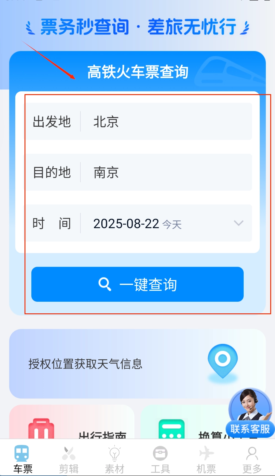 打开应用后,第一步是选择查询类型,能在火车票和机票查询模式之间切换,接着输入出发城市、到达城市以及出行日期等基础信息。