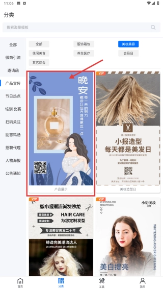 在产品宣传分类里,点击其他美容子分类,就能查看美容类产品的宣传模板。