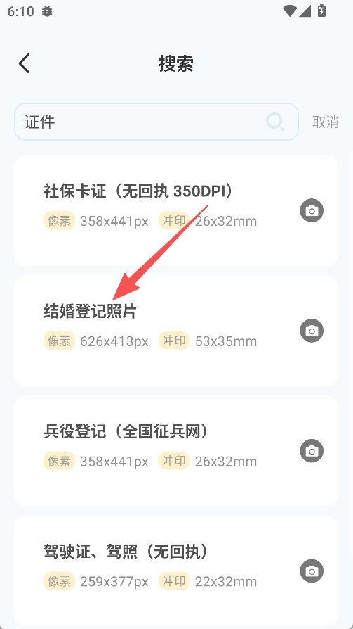 在证件类型选择页面,选择“结婚登记照片”选项,即可进入拍摄界面。