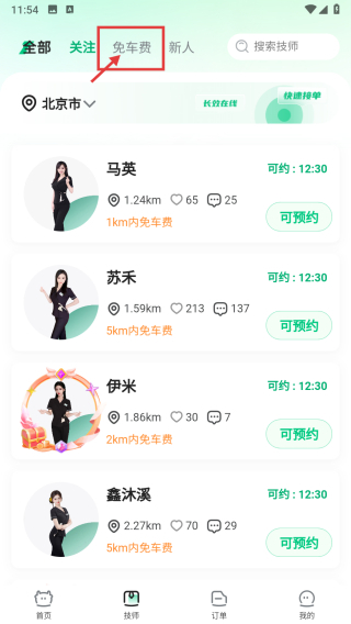 2、在技师页面,点击免车费分类标签,筛选免车费技师。