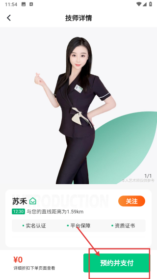 4、在技师详情页,点击预约并支付按钮,完成服务预约操作。