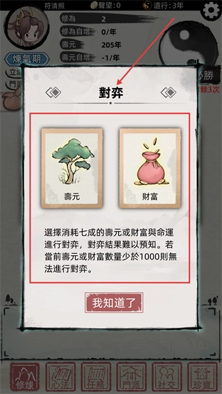 1、当寿元或财富的数量达到标准时,可选择【寿元】或【财富】来进行对弈,消耗七成的资源,尝试获取随机的修仙助力。