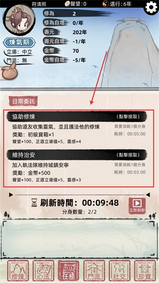 2、日常委托中可消耗分身接取【协助修炼】或【维持治安】任务,快速获取声望金币等修仙资源提升实力。