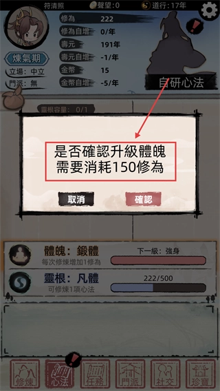 3、积累足够修为后,可确认升级【体魄】,消耗150修为提升体魄等级,助力后续修仙渡劫更顺利。