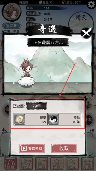 4、奇遇游历结束后,可选择【收取】或开启后【双倍领取】,获取更多声望和修为加速修仙进度。