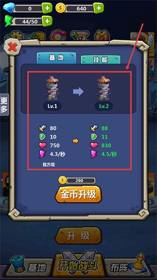 3、技能界面中塔从【Lv1】升级到【Lv2】属性提升,用金币升级塔能增强防御能力,更好御敌。