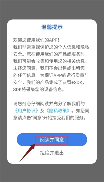 1、首次打开应用时,需要点击确认温馨提示,同意相关内容后才能进入主界面。