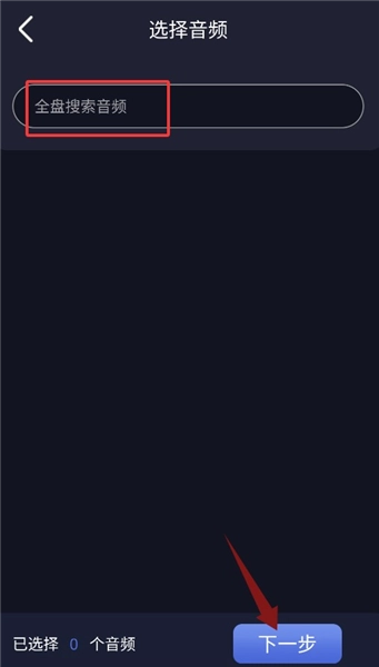3、进入音频选择界面后,通过搜索功能找到目标音频或者直接从列表中选取,接着点击下一步按钮进行编辑操作。