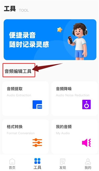 4、工具界面整合了音频提取、降噪、格式转换以及个人音频管理等功能。