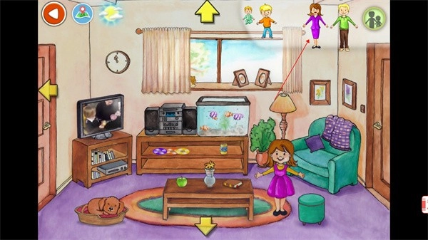 点击上下左右方向的箭头就能切换不同场景,举个例子,要是你想去客厅,点击左边的箭头就行。