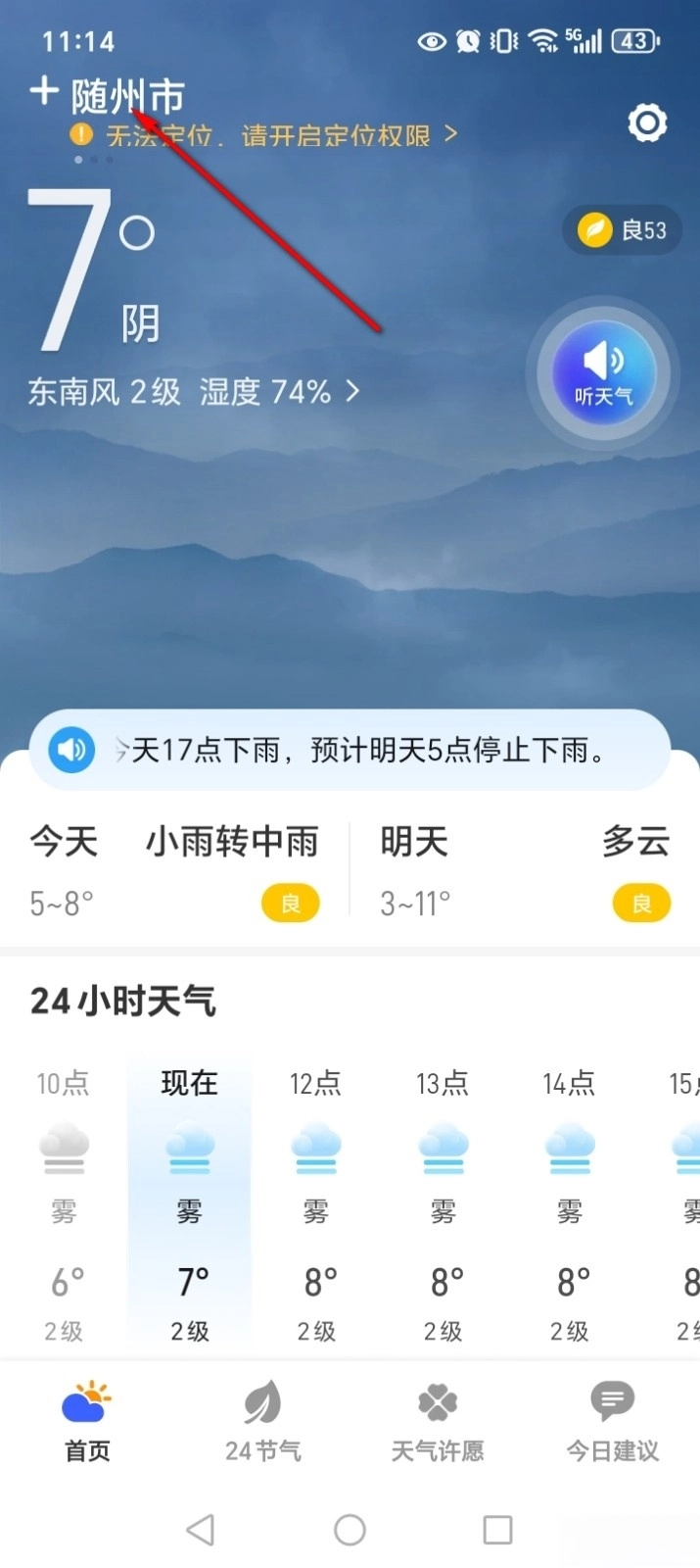 《卫星5G天气报》是长沙意趣软件科技有限公司开发的手机天气预报应用,用户可通过该软件查看未来15天的详细天气预报,以及24小时内逐小时的天气变化,助力提前做好出行与生活安排;此外,软件还提供二十四节气相关知识供用户学习了解,并给出各类实用的生活建议参考。