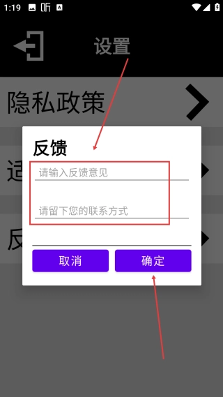 3、在设置列表页,点击【反馈】选项,唤起反馈内容的填写弹窗。