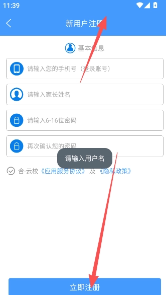 如果提示“用户已存在”,证明该手机号已在“合云校中”有账号,请直接登录使用。