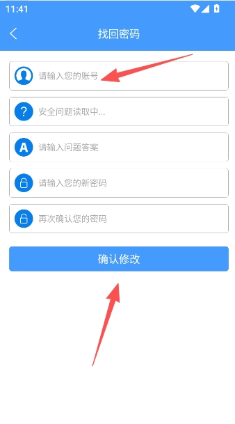 2、在找回密码页面,点击输入各项信息问题答疑,点击确认修改完成密码找回的操作。