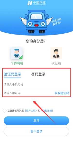 1、进入真好运司机,选择你的身份,然后验证码登录。