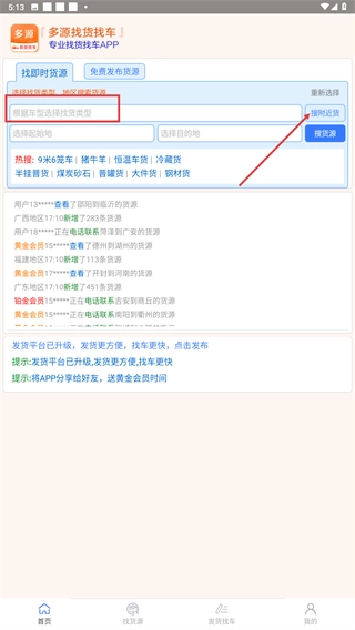 1、打开多源找货找车应用,首先选择【找货类型】,填写相关筛选条件,为找到合适的货源信息做好准备。