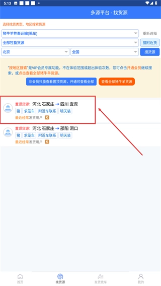 3、筛选后展示货源列表,点击【河北-四川】的货源条目,查看货主及详细运输需求信息。