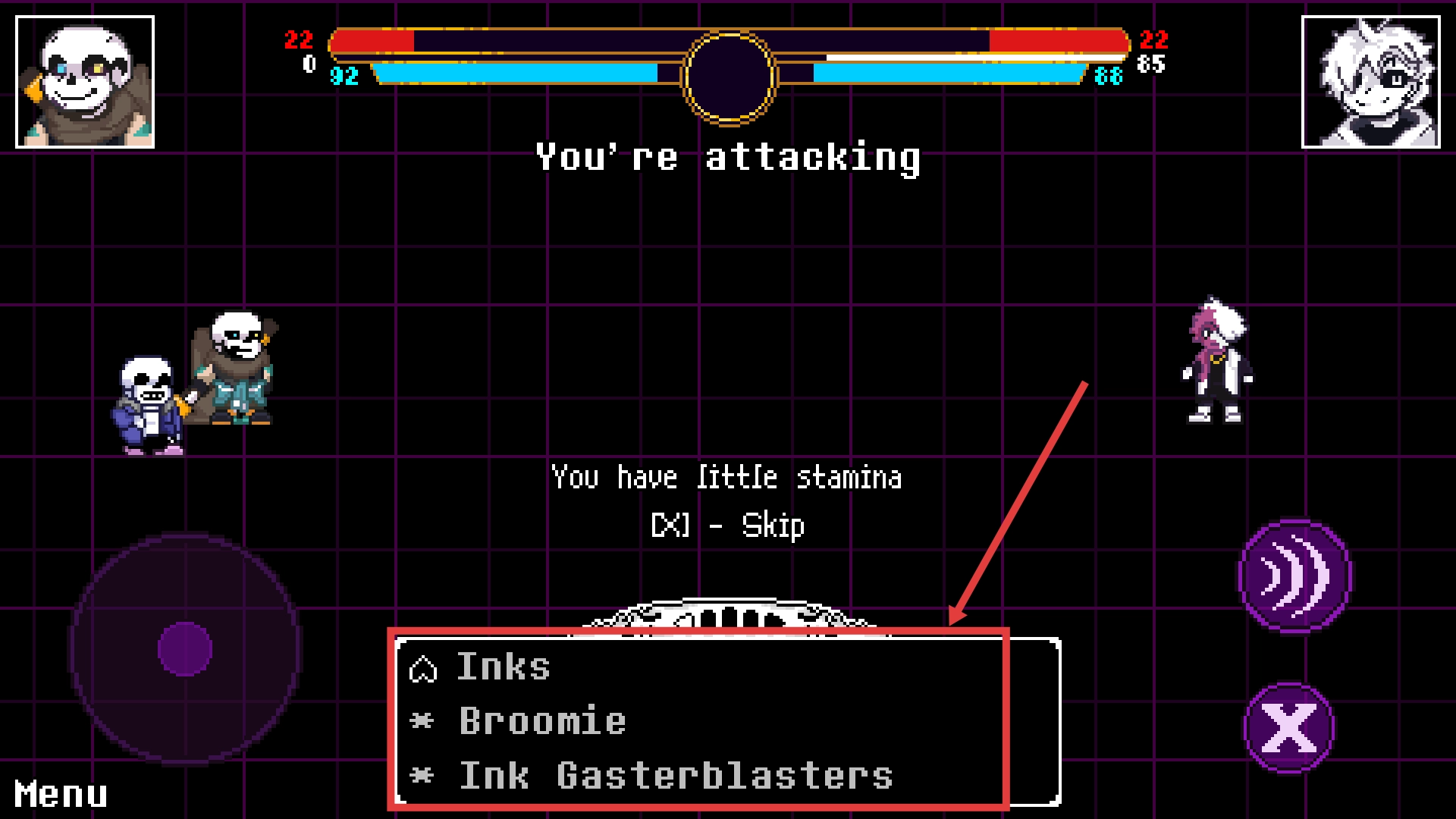 4、攻击时可选择【Inks】-【Broomie】-【InkGasterblasters】等技能,合理搭配技能提升战斗效率。
