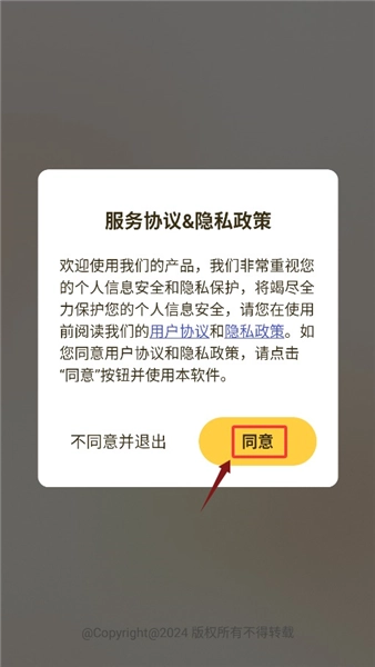 1、首次启动应用需点击同意服务协议和隐私政策,确认后方可进入。