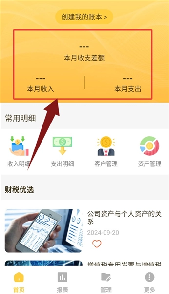 2、首页展示本月收支差额、收入总额与支出总额等财务概览。
