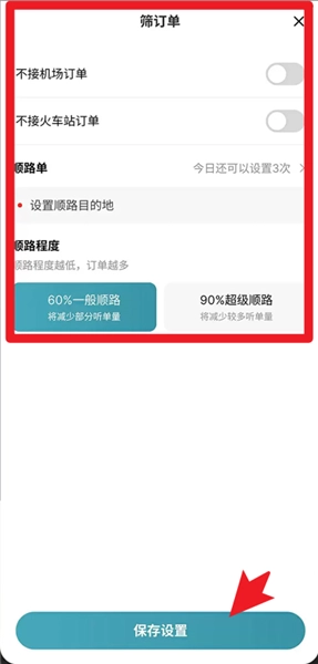 4、利用筛订单功能能够设置是否承接机场单、火车站单,还可以调整顺路单的程度,完成后点击保存设置就可以了。