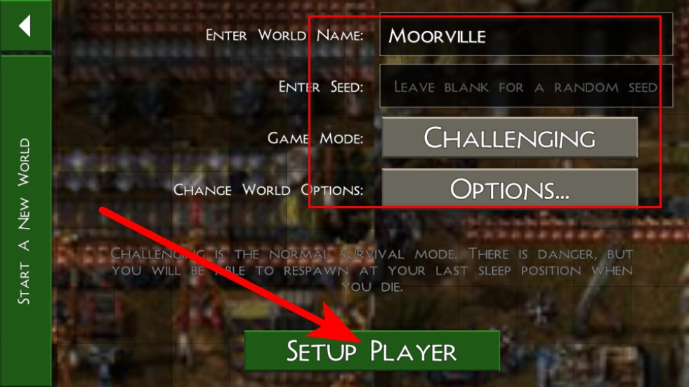 2、在世界创建页设置世界名称、模式后,点击SETUP PLAYER进入游戏。