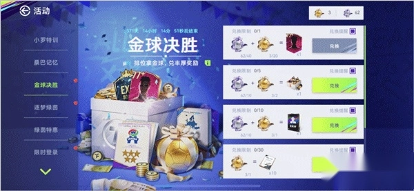 银球可以通过生涯赛获得,银球不限制获取数量,金球可以通过天梯比赛获得,金球每日上限15个。活动中40个银球+20个进球可以兑换77+的红卡球员