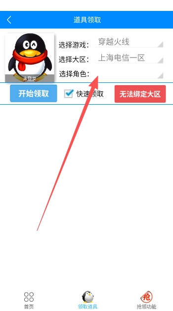 2、在道具领取页面,玩家们可选择所在游戏区服,点击绑定所要领取的角色账号,点击开始领取,等待道具领取到账即可。