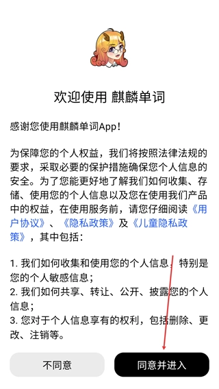 1、阅读【麒麟单词】的欢迎弹窗,点击【同意并进入】按钮。
