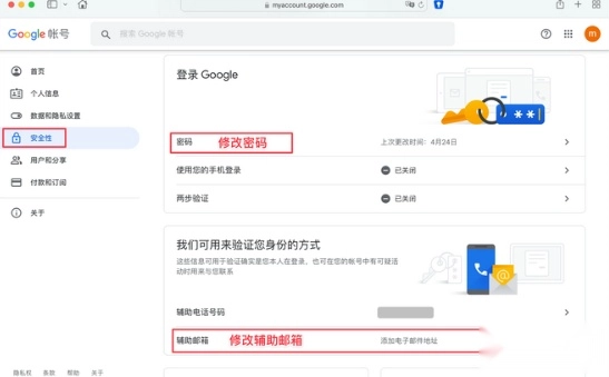 点击安全性,找到密码进行修改,再将辅助邮箱改为自己的邮箱