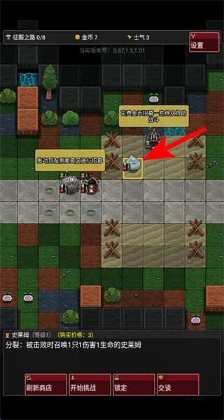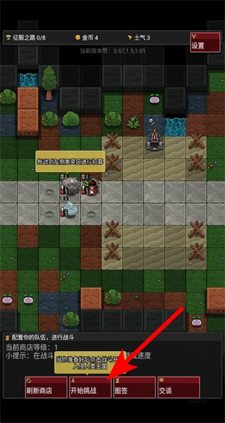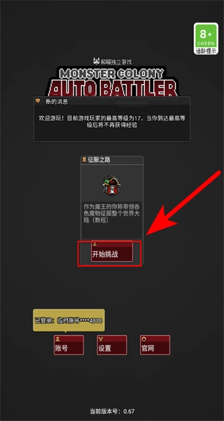 1、在游戏启动界面,点击开始挑战按钮,这是进入征服之路教程关卡的关键操作,点击后开启怪物精灵的养成与流程。