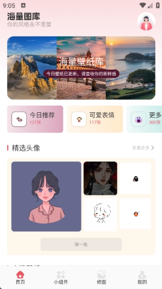 1、在首页中提供了海量壁纸库,有今日推荐、可爱表情、精选头像等信息;