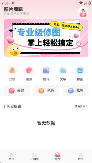 4、在修图页面中有滤镜、贴纸、旋转、文字、拼图、美颜、涂鸦以及裁剪等功能。