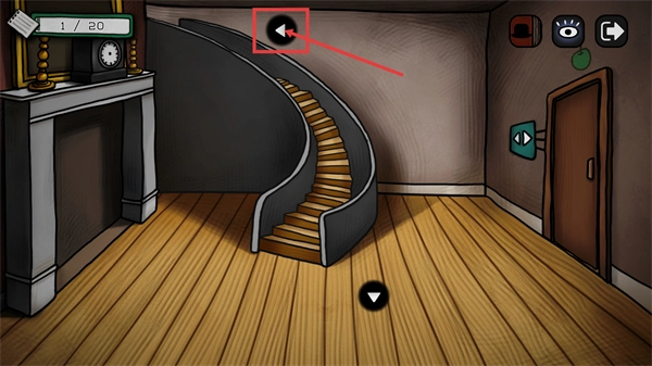 2、当前探索进度为【1/20】,可通过界面上的箭头按钮操控移动,目标是探索包含楼梯与壁炉的场景,以此推动游戏的探索进程。