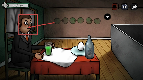 3、留意角色视线投向的墙面装饰区域,同时关注桌上的绿色饮品、鸡蛋等物品,从中寻找能够交互的解谜线索。