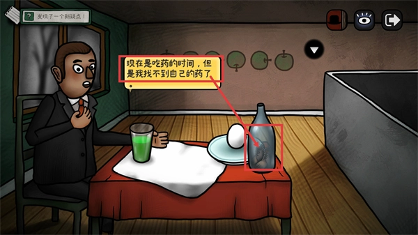4、按照角色话语的提示,查看桌上瓶子里的药,触发【发现了一个新疑点!】的提示,推动当前解谜环节的进行。