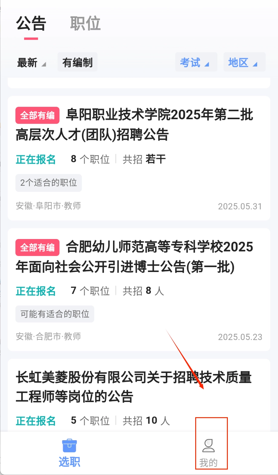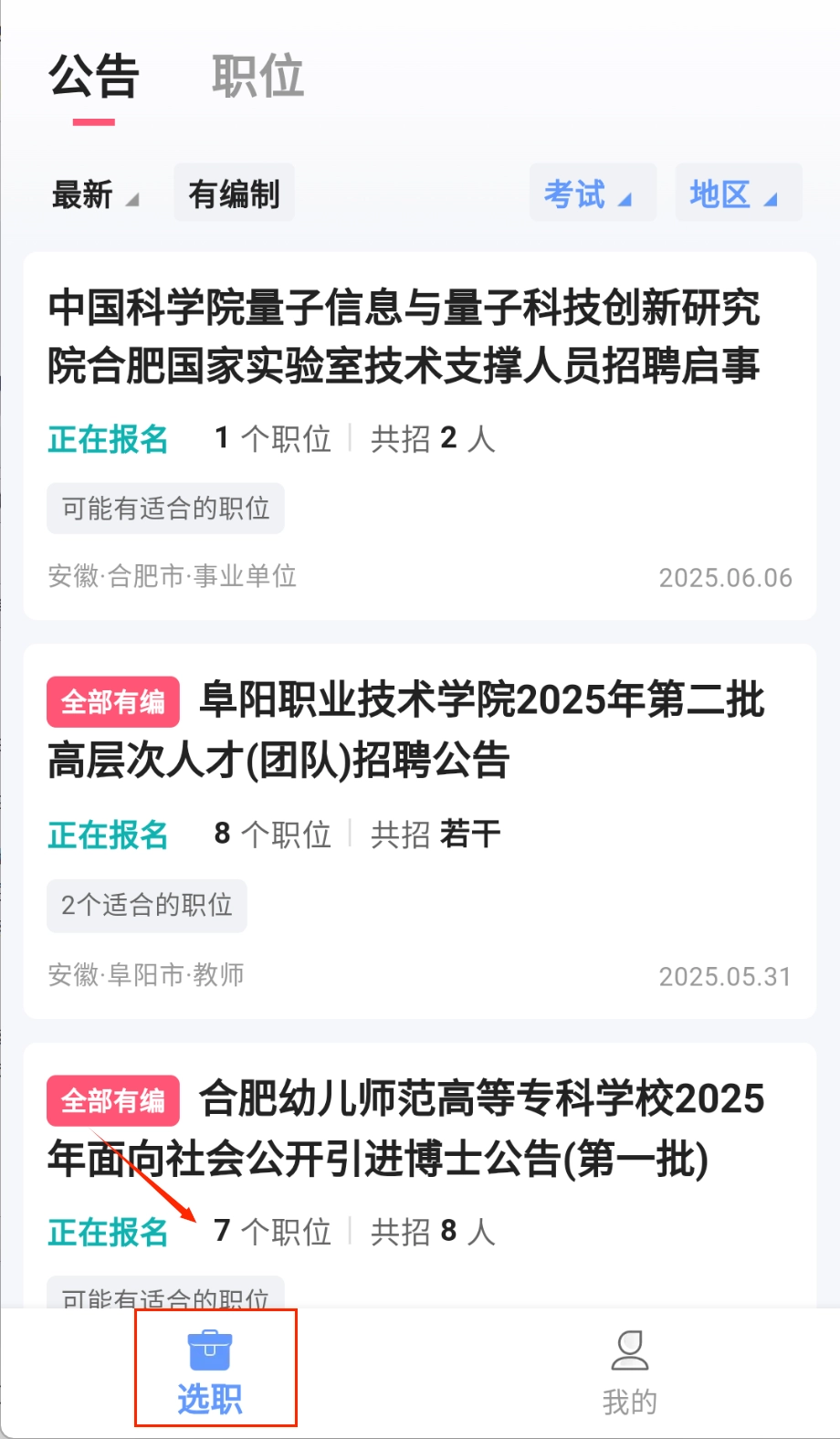 2、在公告中心可以查看全国各地最新的招考信息,支持按地区、考试类型和发布时间等多维度筛选,遇到感兴趣的岗位可以直接收藏关注。