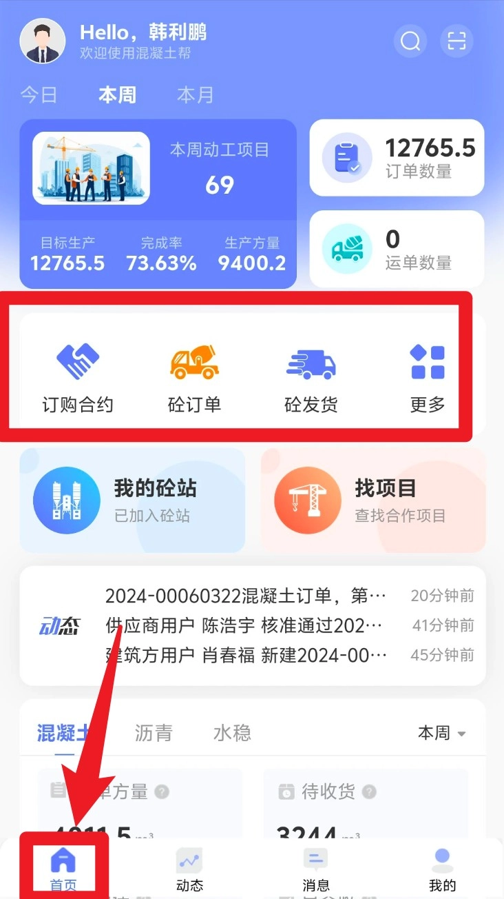 3. 登录成功后默认跳转首页,可查看当前订单量、发货量、动工项目数等数据,并快速进入合同等功能模块。