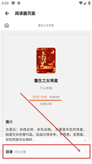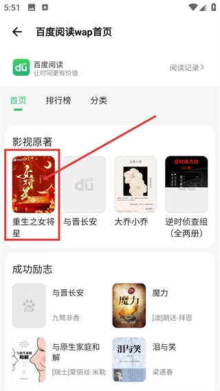 2、在【百度阅读】的影视原著分类页面里,找到并点击【重生之女将星】的小说封面,即可进入该小说的详情页面。