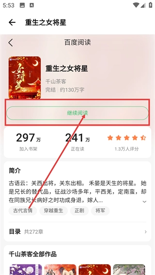 3、进入小说详情页后,点击【继续阅读】按钮,就能进入阅读器页面,继续阅读小说内容。